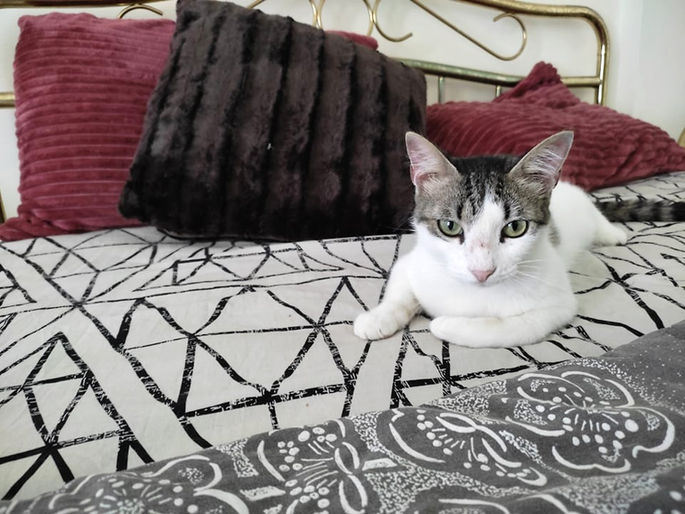 Boutanya was found after her previous owner had been in the street trying to give her away for free. When he could not find anyone to take her, he just left her behind. She stayed outside hiding in a corner until Hajar came back later that day and took her into the shelter. Initially, she was nervous, but within a few days she completely warmed up to both Hajar and the other cats. She is very sweet cat who loves people, and enjoys spending her time lounging around with her shelter mom.